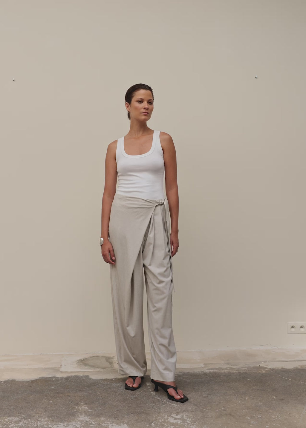 A unique trouser designed with a distinctive overlap closure that creates beautiful volume and movement.